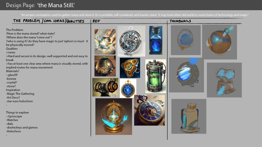 Here you can see a “Mana Still” that I designed, along with my ideation process: